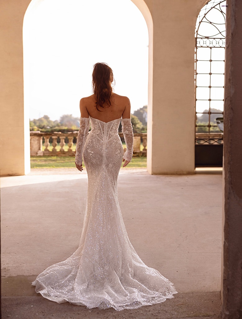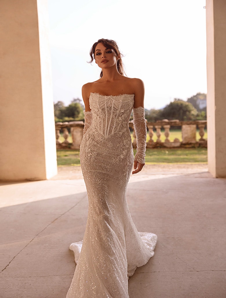 Astrid ist ein elegantes, figurbetontes Brautkleid im modernen Glamour-Stil. Das Kleid ist aus feinstem Tüll gefertigt und mit funkelnden Pailletten, Perlen und floraler Spitze veredelt. Das Korsett im Bustier-Stil mit sichtbaren Stäbchen sorgt für eine wunderschöne definierte Taille. Die abnehmbaren langen Spitzenärmel verleihen dem Look eine romantische und zugleich sinnliche Note. Der figurbetonte Schnitt betont sanft die Silhouette und geht in eine elegante Schleppe über, die dem Kleid eine majestätische Ausstrahlung verleiht. Ideal für Bräute, die von einem glamourösen Auftritt mit einem Hauch von Extravaganz träumen.