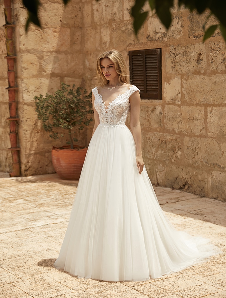 ,,Jolie” is a stunning princess-style wedding dress with floral lace and soft tulle. This off-the-shoulder gown by Bianco Evento makes a statement with a Queen Anne neckline in the front and an illusion effect in the back.