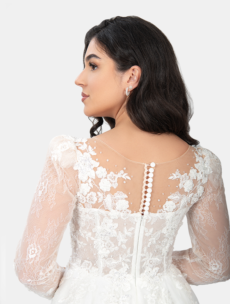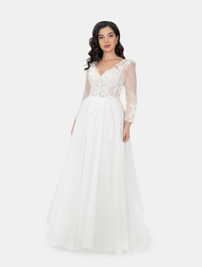 Das Brautkleid ,,Edith“ von Irvalda Brautmode Wien verbindet klassische Eleganz mit romantischer Raffinesse. Das Oberteil aus transparenter, fein bestickter Spitze mit einem tiefen, aber eleganten V-Ausschnitt unterstreicht die feminine Silhouette. Die 3/4-Ärmel aus zarter Spitze verleihen dem Kleid einen besonders edlen, zeitlosen Charakter – ideal für Bräute, die ein Langarm Brautkleid oder ein Kleid für kühlere Jahreszeiten suchen.