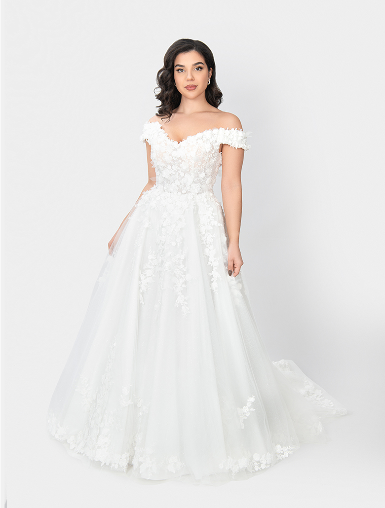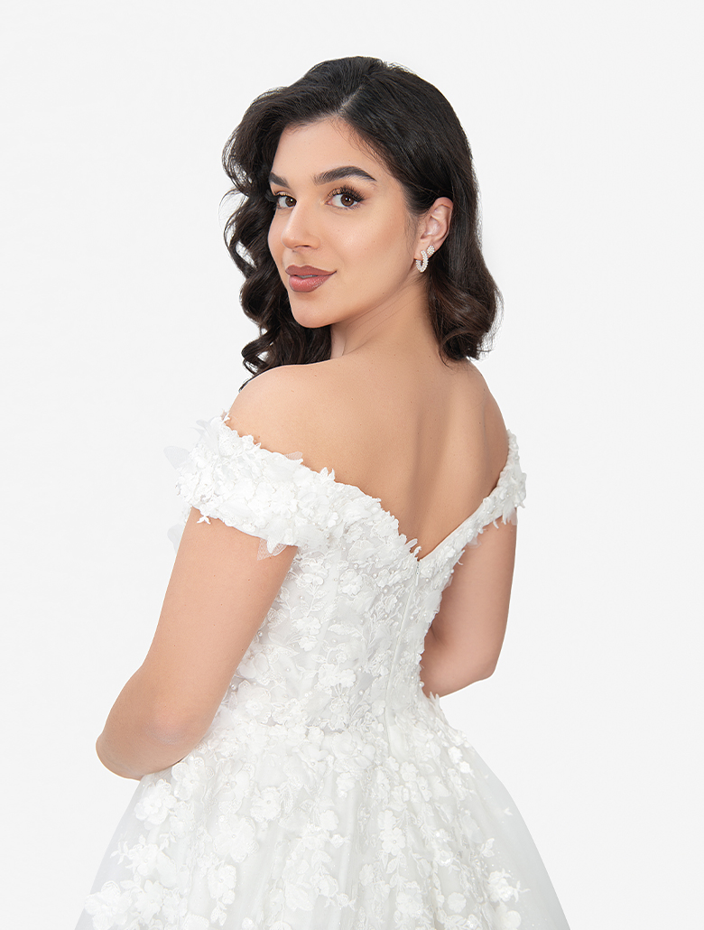 Das Brautkleid ,,Flower 2“ von Irvalda Brautmode Wien ist ein traumhaft romantisches und zugleich luxuriöses Kleid, das durch seine spektakulären 3D-Blüten besonders hervorsticht. Das Off-Shoulder Oberteil mit feinen Blütenapplikationen schafft eine feminine, zarte Silhouette und betont wunderschön die Schultern und das Dekolleté. Die kunstvoll platzierten 3D-Blumen verleihen dem Kleid Tiefe, Struktur und eine elegante Couture-Optik.