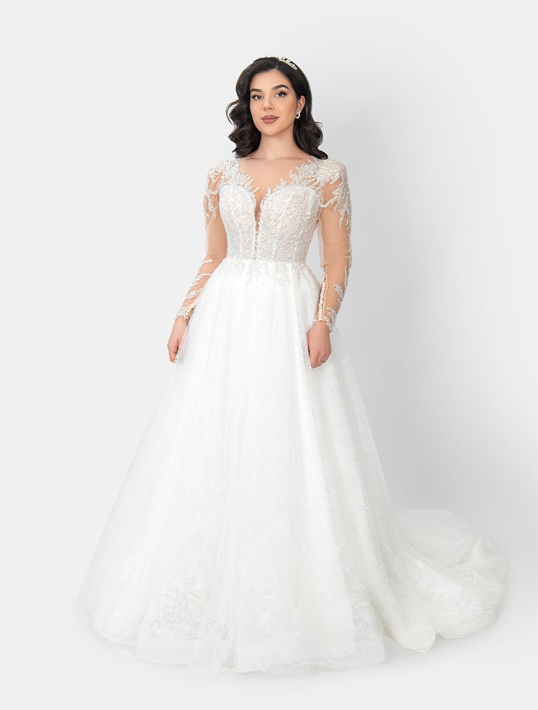 Das Brautkleid ,,Mia“ von Irvalda Brautmode Wien ist ein elegantes und glamouröses Hochzeitskleid für Bräute, die ein besonders edles und detailreiches Design suchen. Das Oberteil besticht durch einen tiefen V-Ausschnitt mit Illusion-Tüll sowie prachtvollen, silbrig-glitzernden Spitzenapplikationen, die eine luxuriöse und feminine Silhouette formen. Die langen Ärmel aus transparentem Tüll, ebenfalls mit funkelnder Spitze verziert, verleihen dem Kleid eine royale Ausstrahlung.