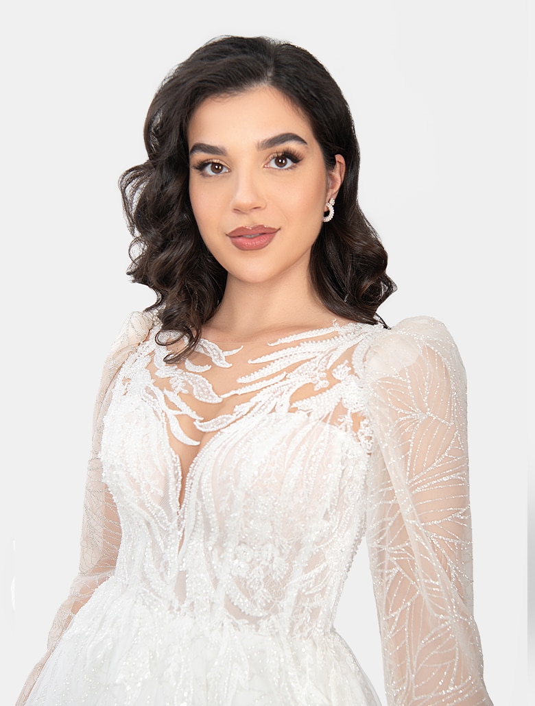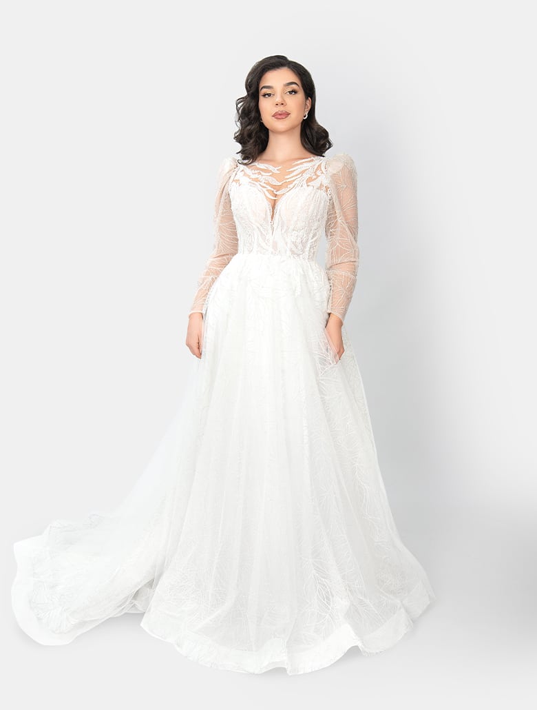 Das Brautkleid ,,Vally“ von Irvalda Brautmode Wien ist ein Statement aus Eleganz, Glamour und feiner Couture-Optik. Das Oberteil beeindruckt mit einem tiefen V-Ausschnitt, kombiniert mit transparenter, kunstvoll bestickter Spitze, die einen modernen und zugleich luxuriösen Look schafft. Die langen Ärmel aus feinem Illusion-Tüll mit detailreicher Stickerei verleihen dem Kleid eine exklusive, hochwertige Ausstrahlung – perfekt für Herbst- und Winterhochzeiten oder Bräute, die ein prächtiges Spitzenkleid suchen.